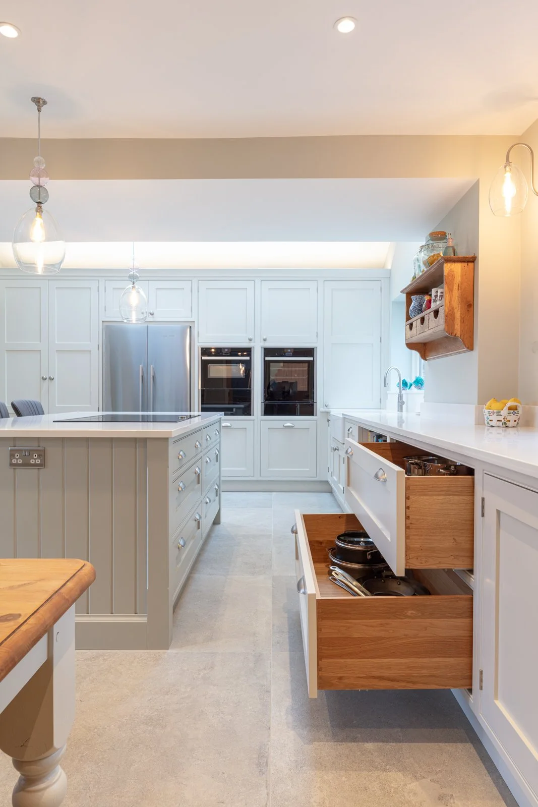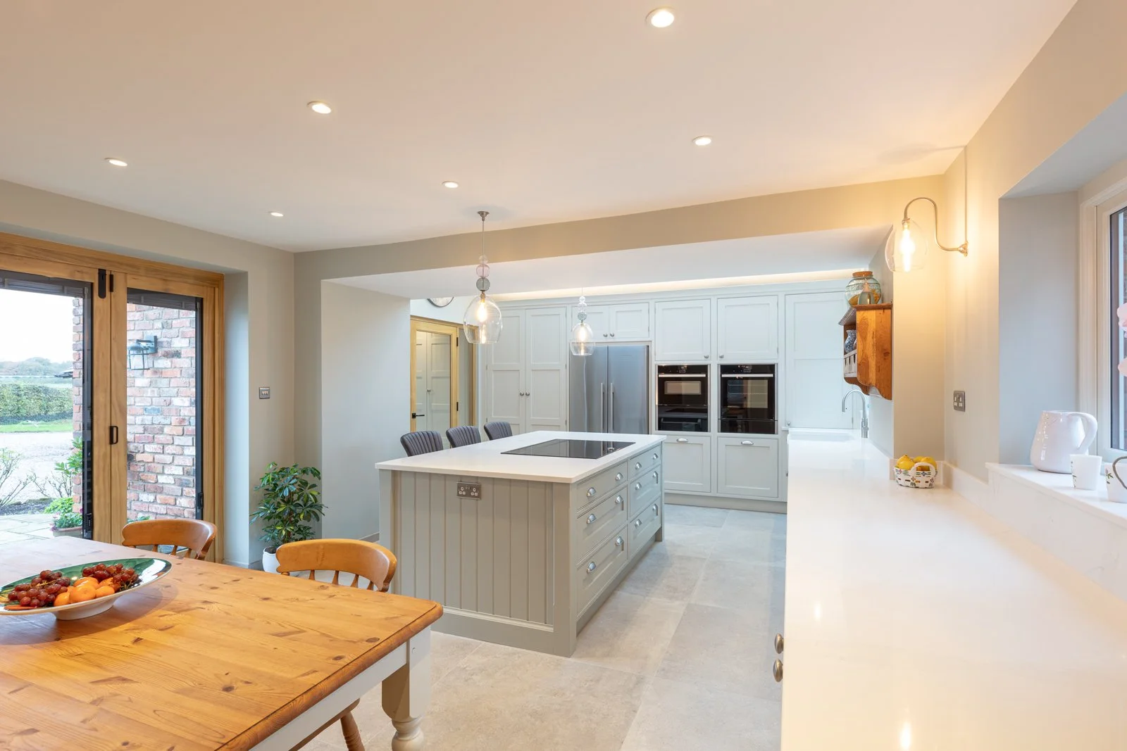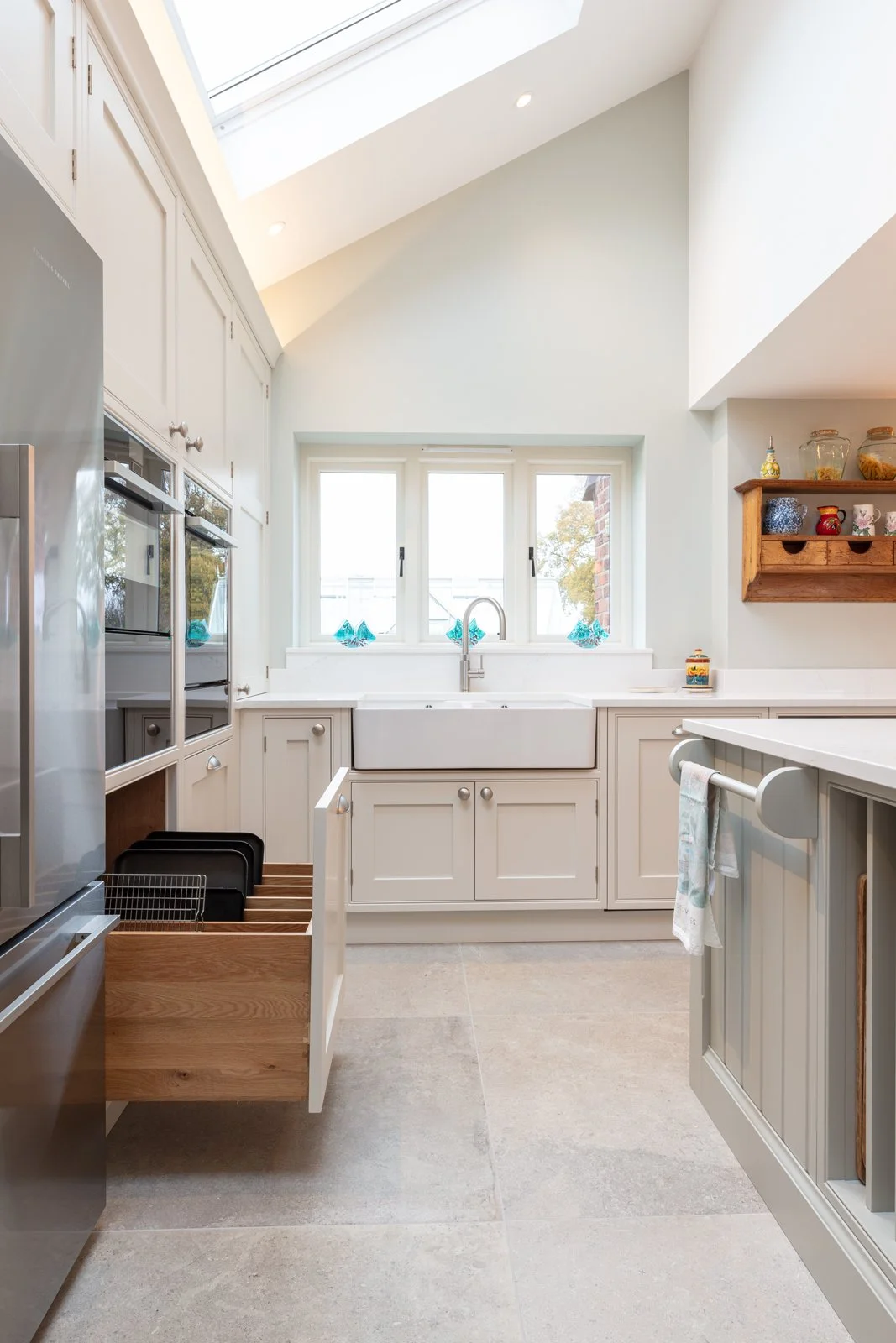 Symmetry drives every face frame, door and handle line, so your eye settles quickly. Oak repeats across shelving, larder internals and wine store, binding the furniture to the farm setting. Hardwearing twenty-millimetre quartz worktops and porcelain flooring handle family traffic while feeling refined. Integrated towel rail, open tray storage and scalloped drawers prove that function can sit openly in sight without fuss. The result is a light, ordered workspace in this High Legh kitchen that supports family cooking, dining and effortless flow from muddy boots to plated supper through busy days. Check out our skinny shaker kitchen.