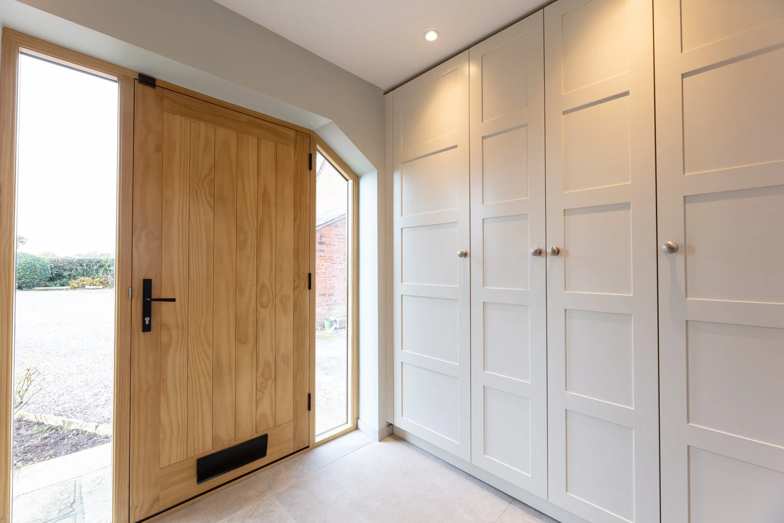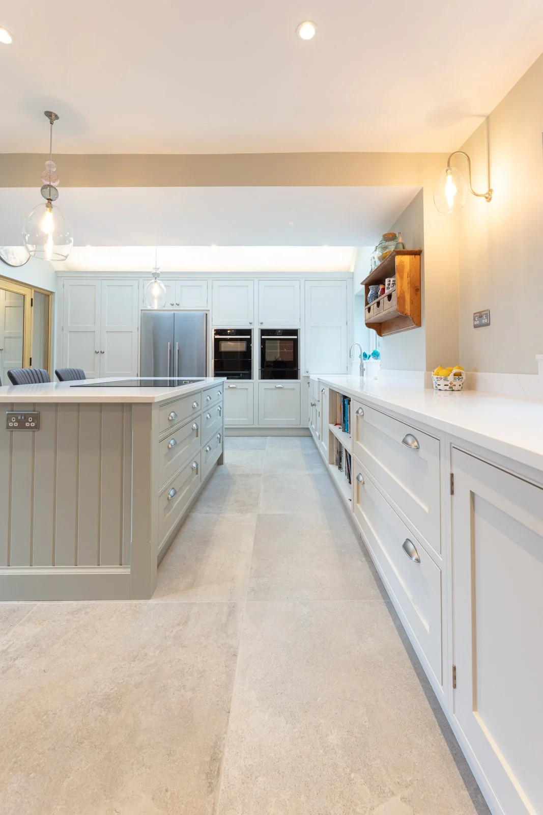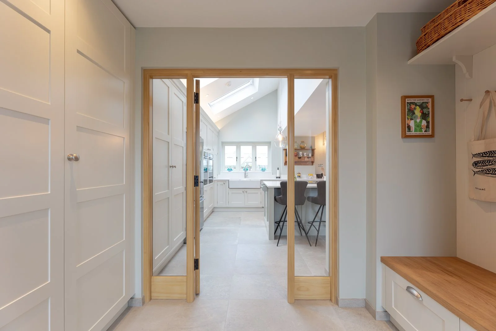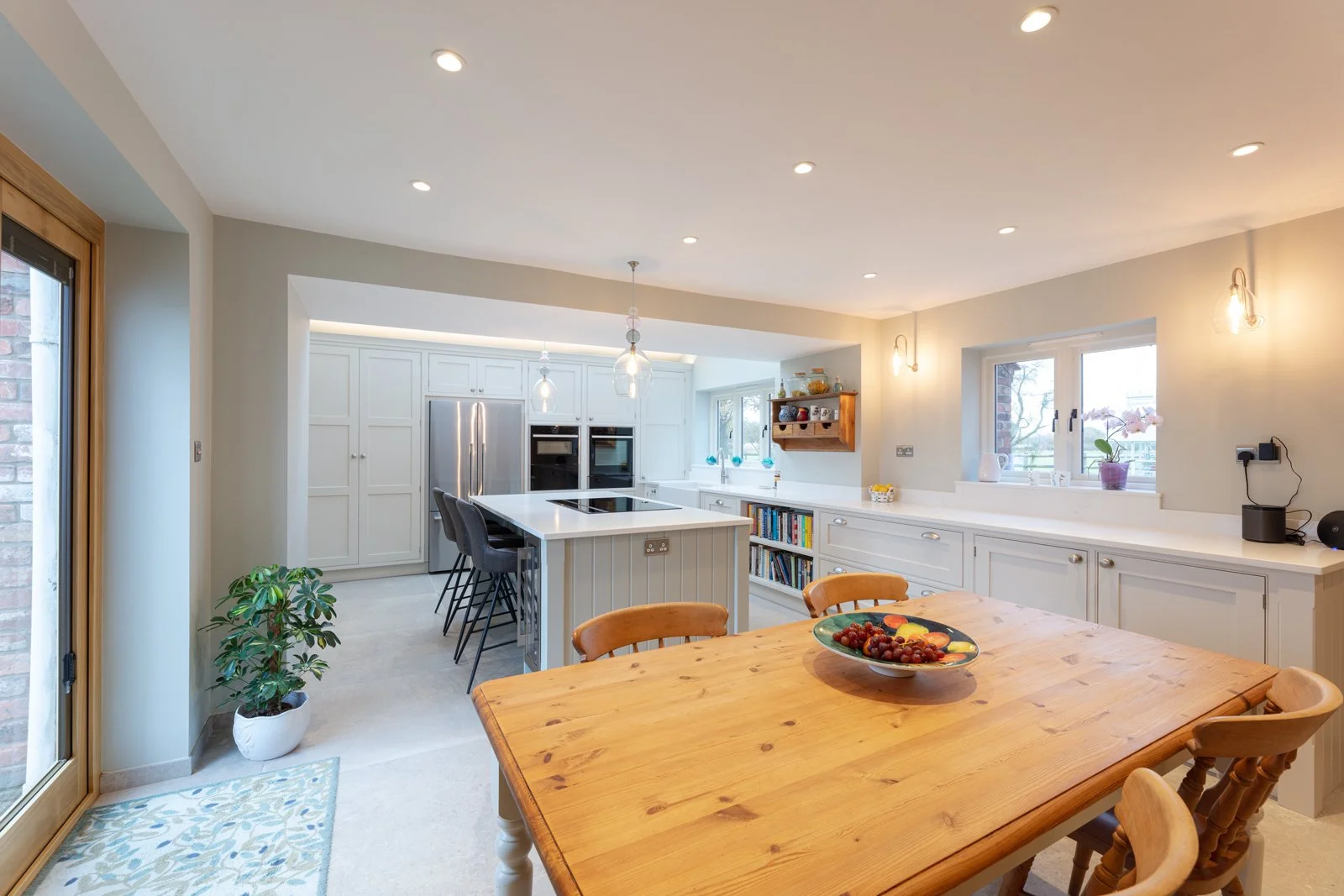 Symmetry drives every face frame, door and handle line, so your eye settles quickly. Oak repeats across shelving, larder internals and wine store, binding the furniture to the farm setting. Hardwearing twenty-millimetre quartz worktops and porcelain flooring handle family traffic while feeling refined. Integrated towel rail, open tray storage and scalloped drawers prove that function can sit openly in sight without fuss. The result is a light, ordered workspace in this High Legh kitchen that supports family cooking, dining and effortless flow from muddy boots to plated supper through busy days. Check out our skinny shaker kitchen.