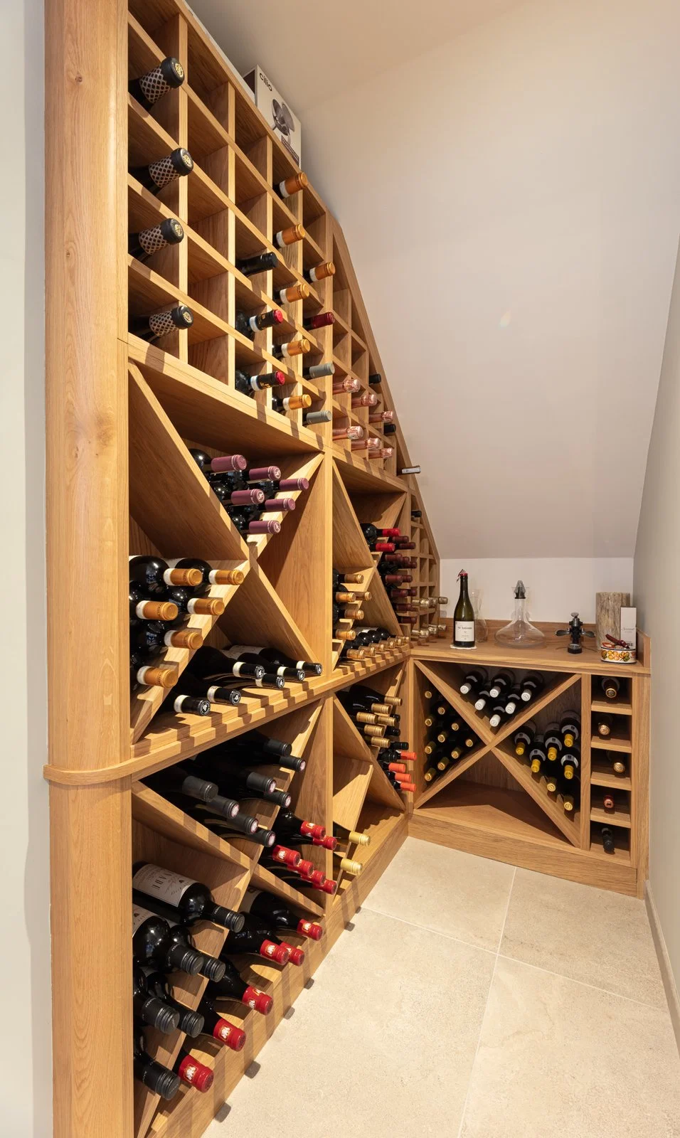 • Retained oak wall rack anchors the scheme and repeats the timber tone.
