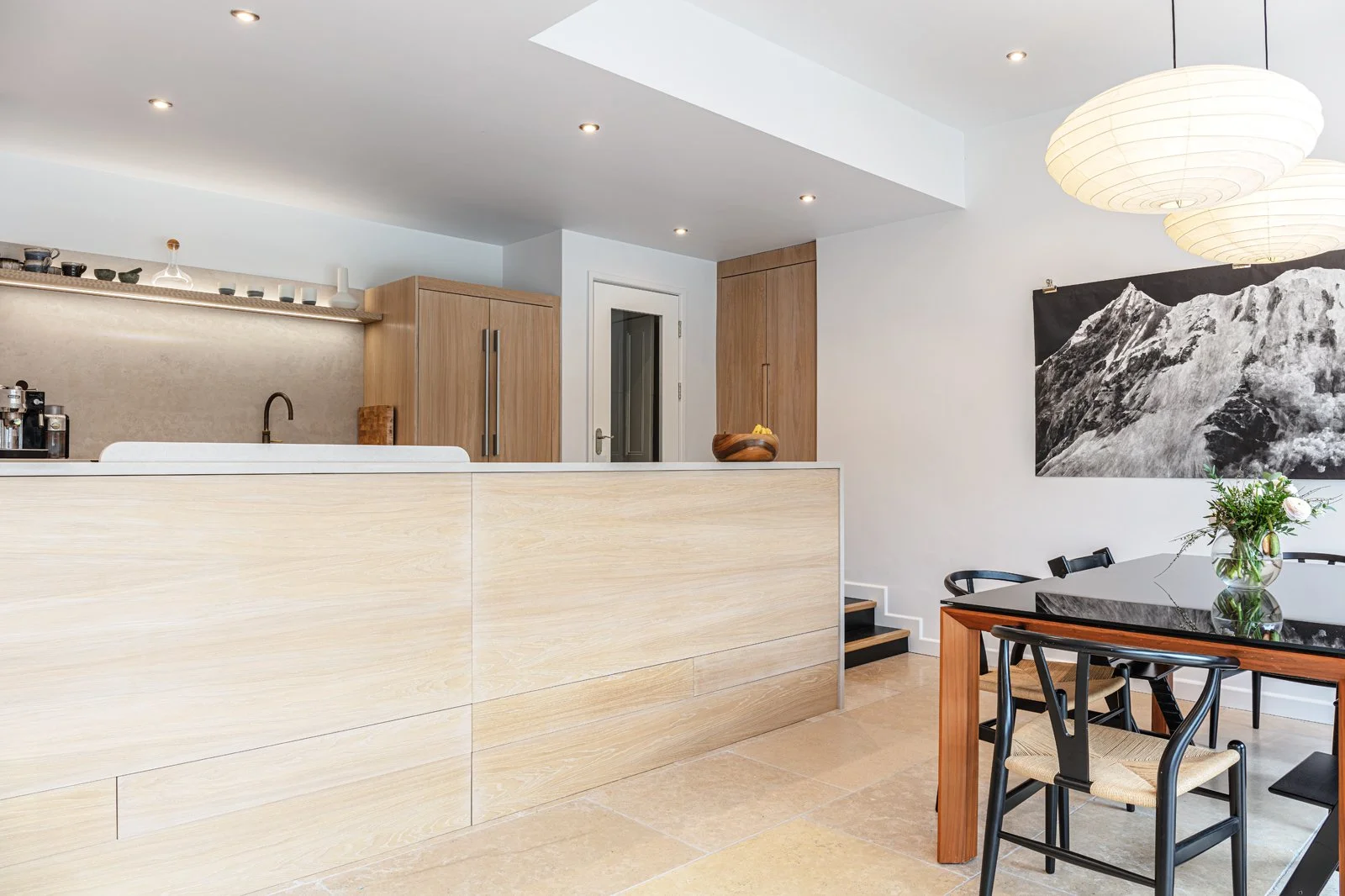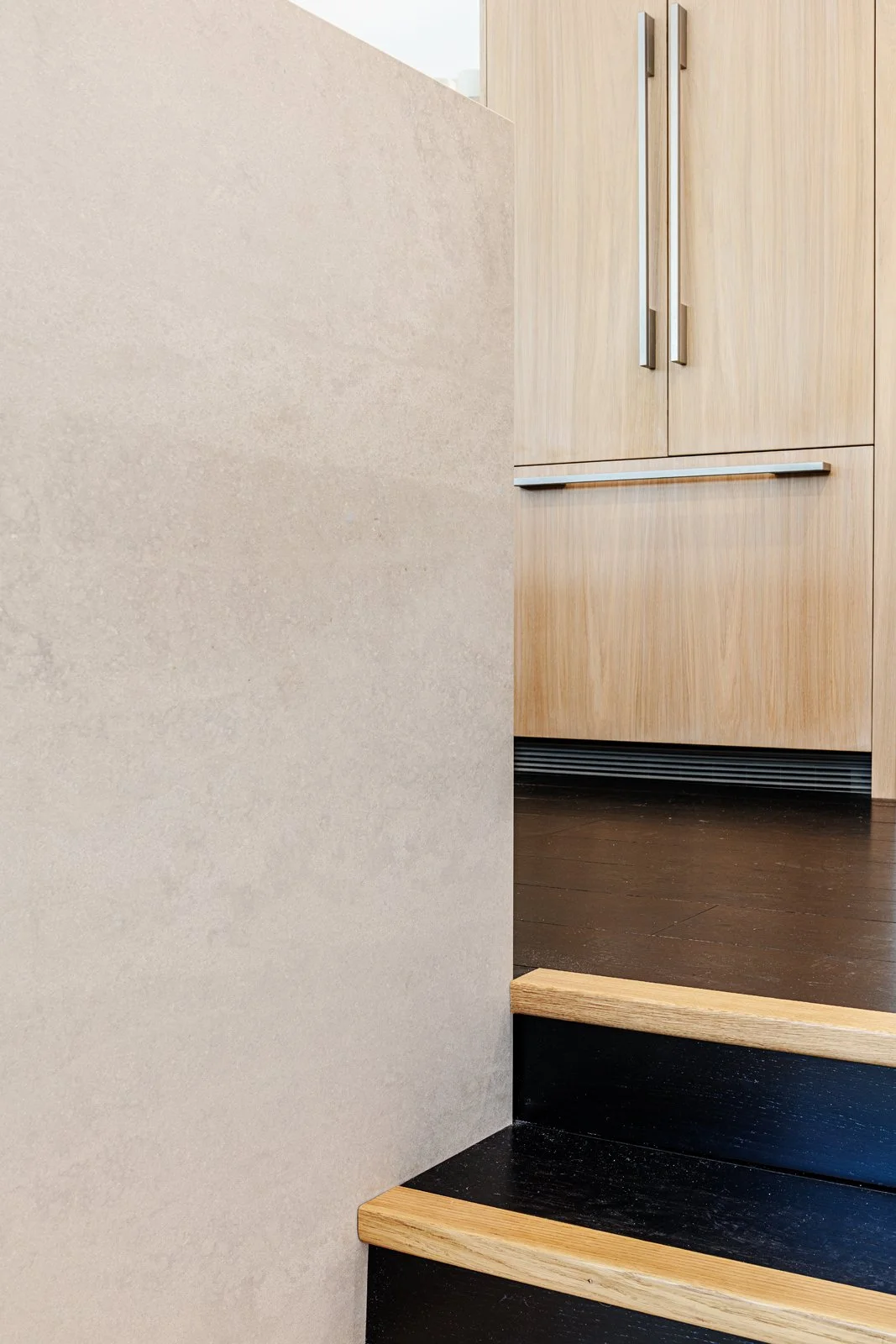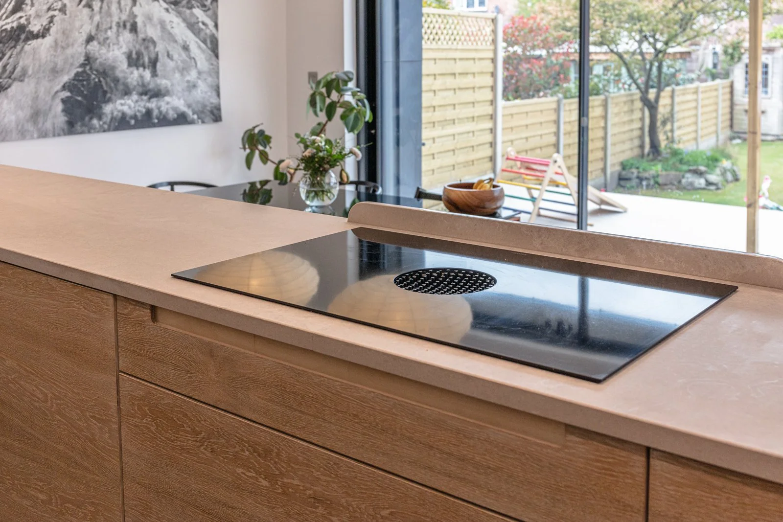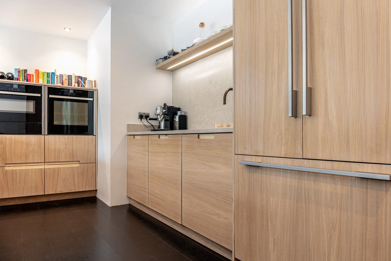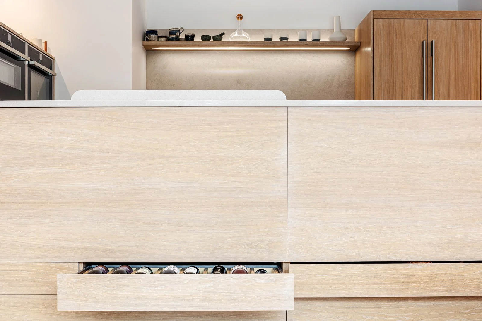 Introducing "Natural Scandi," a bespoke kitchen that epitomizes the serene simplicity of Scandinavian design infused with organic charm. This space is a symphony of natural textures, featuring oak ply handle-less cabinetry with a hand-applied limed finish that accentuates the wood's raised grain, creating a continuous, harmonious flow. The tactile beauty of the cabinets is complemented by the cool sophistication of the concrete-effect quartz worktops, embodying a muted color palette that soothes the senses. Every detail, from the Bora X-Pure venting hob to the secret drawers within the peninsula island, is meticulously integrated, ensuring functionality without sacrificing the kitchen's understated elegance. With an integrated French-door fridge/freezer by Fisher and Paykel, "Natural Scandi" is a retreat of tranquility and refined, minimalist living. Alternatively, check out our Japandi kitchen design.