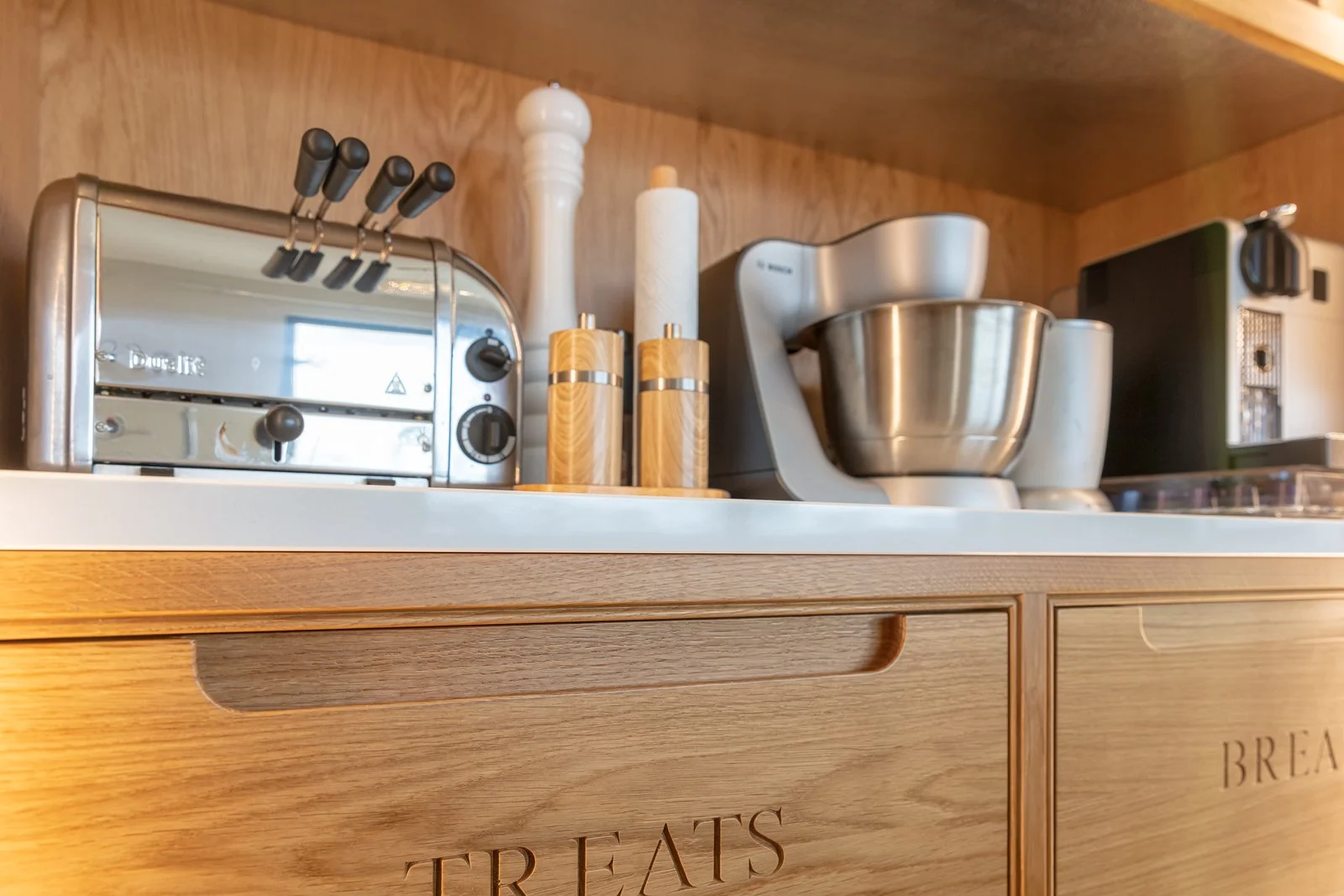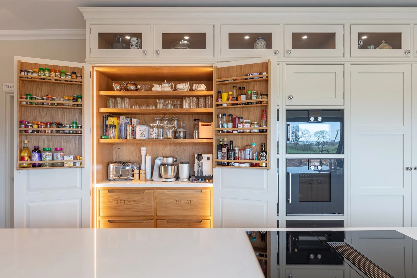 Walk-in pantries, breakfast cupboards and bespoke larder cabinets provide space for dry goods, small appliances and serving pieces without cluttering worktops. Integrated pantry lighting improves visibility while maintaining a calm appearance when doors are closed.